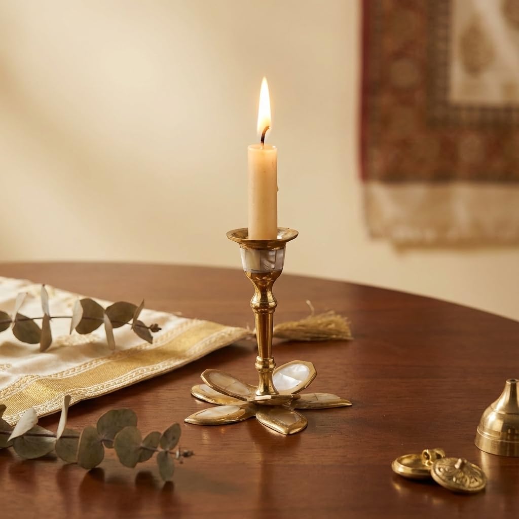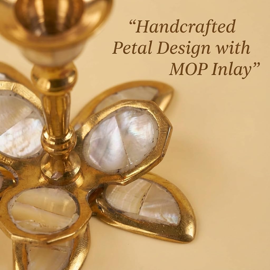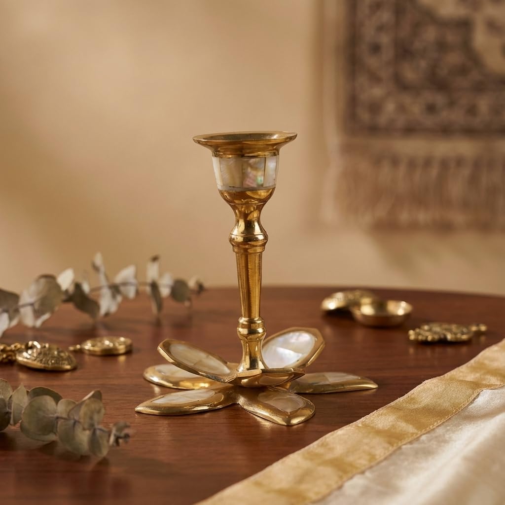 Single Brass & Mother of Pearl Candle Holder for Taper Candles – Decorative Candlestick for Home, Bedroom, Living Room Decor, Table Centerpieces (Petals – Short) 6 x 6 cm – Pack of 1